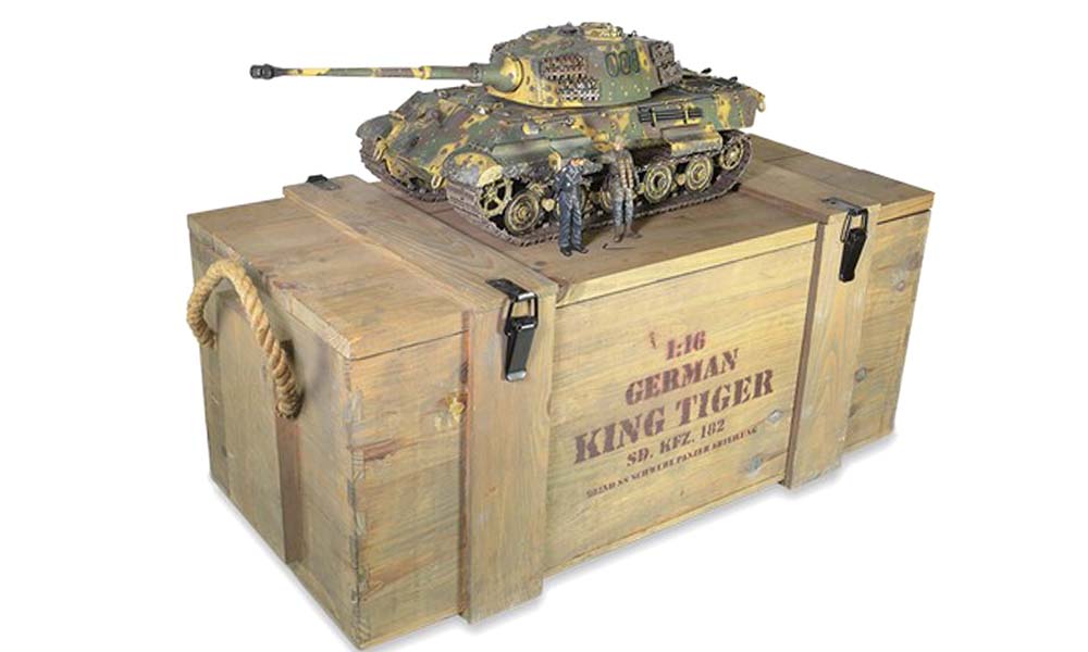 This year marked a significant milestone for Forces of Valor since its establishment, achieving immediate success with the core 1/32 scale Armored Fighting Vehicles line. It took many collectors by surprise that they would even consider producing a larger scale model - the 1/16 scale extreme metal series, which measures longer than the average adult's arm, featuring an impressive 30-inch long diecast tank. Had the Forces of Valor King Tiger model been submitted for nomination, it likely would have secured a Guinness record in 2004. The King Tiger tank includes a complete interior, extending from the chassis to the turret, with functional hatches, robust diecast caterpillars, and a turret crafted from diecast metal that boasts a realistic metal casting surface. Words fail to capture the stunning nature of this model; it must be seen and touched in person to be truly appreciated. The tank is securely housed within an ammunition case-inspired wooden crate, and after more than twenty years, no other military collectible brands have come close to offering a similar model, which solidifies the uniqueness of Forces of Valor among enthusiasts.